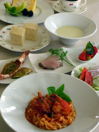 オマール海老又はロブスターの生パスタ、、自家製手打ちピザ、自家栽培米の黒米入りのリゾット又はラザニア 自家製ケーキ、ドリンク】